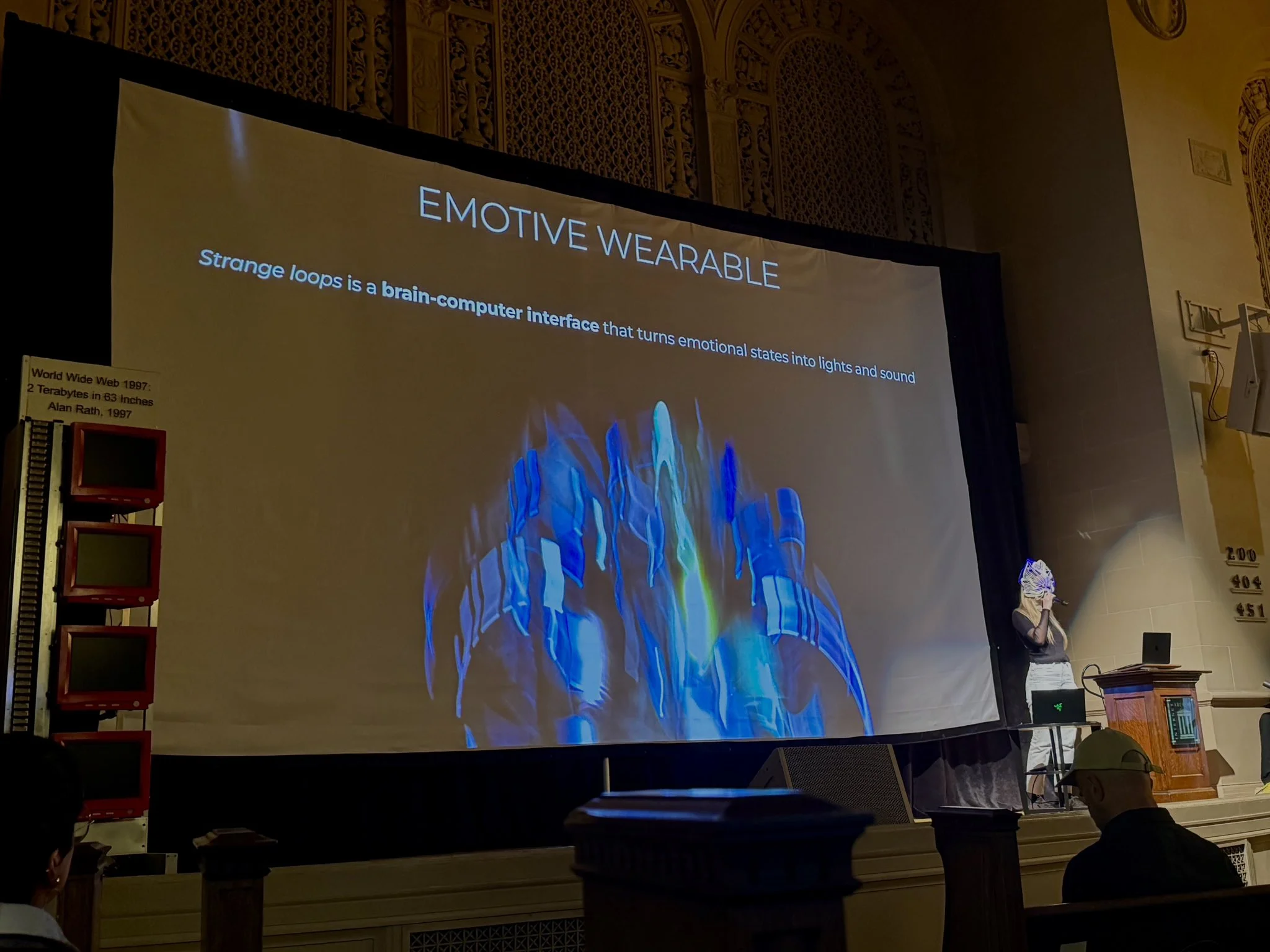 Strange loops is a brain-computer interface that turns emotional states into colorful lights. Inspired by electric fields from the brain amplified by EEG, the mask reveals and augments the feelings of the wearer. By externalizing the inner world, it creates a language of the imperceptible. In this respect, it investigates how wearable technology can create new forms of nonverbal communication.